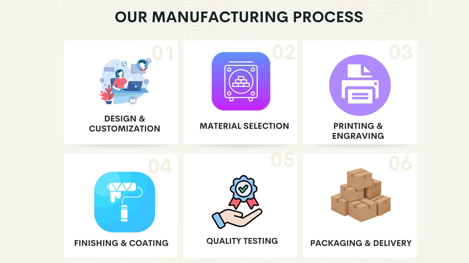 Using advanced screen printing, etching, and engraving techniques, we ensure precision and clarity in every design.